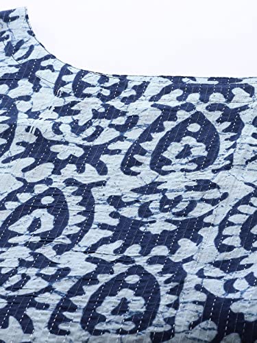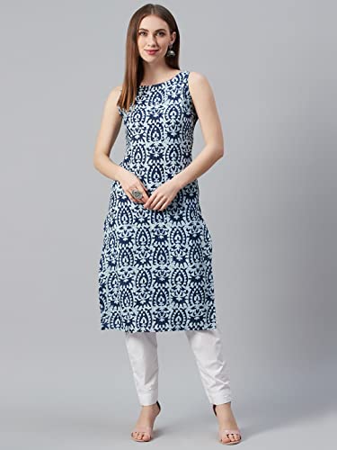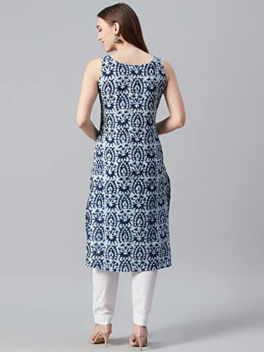 This stylish Sleeveless kurta from Amudee Fashion will take your personal style to new heights. This Multicolor printed straight kurta, has a round neck, sleeveless, straight hem, side slits. This green blue piece is a stylish option to pair with churidar leggings.