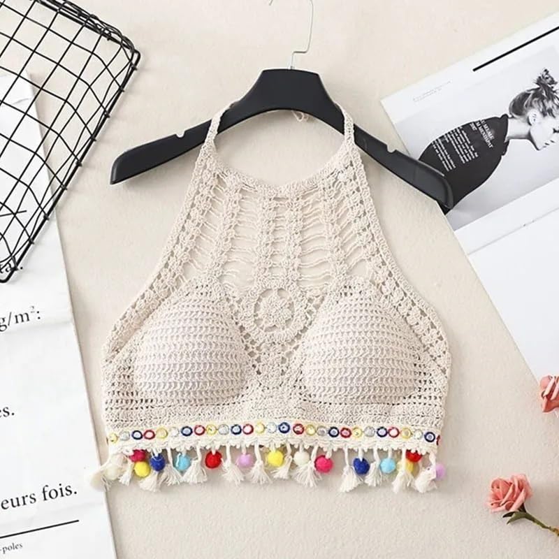 ✅ ✅ (One Size XS-S-M) Bust 28 -34 Inch ✅ ✅ Comfy and stretch material, it is breathable and skin-friendly to wear Features: crochet, knitted, sleeveless, halter neck, tie knot back, opening back, wirefree, non removable padding, fringe trim, bralette, crop halter top matreial =cotton