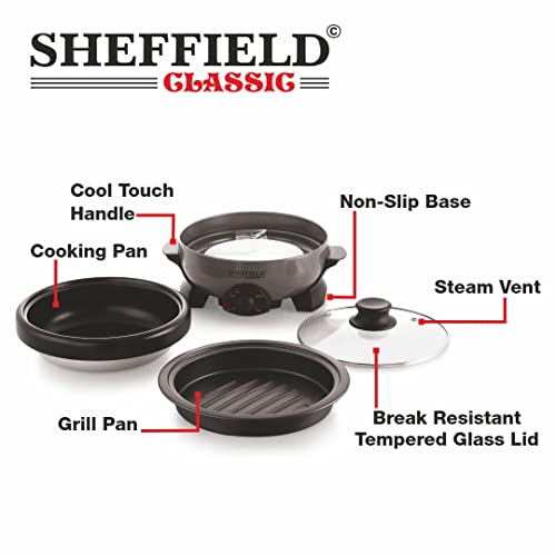 Sheffield Classic 3 in 1 Multipurpose cooker comes with Tempered glass metastable lid which gives it an elegant look, also non-stick coating of detachable pans and pots.