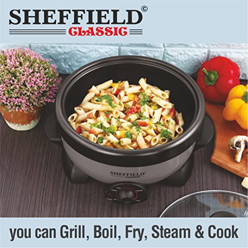 Sheffield Classic stands as one of the leading Electric Cookware Manufacturing company.This Sheffield Classic 3 in 1 Multi cooker SH-5004 is a multi-purpose cooker which can be used to meet daily needs of Boiling, Grilling, Steaming, frying, Roasting and Cooking.This 3 in 1 Multi cooker comes with aluminium cooking pans that not only aid in cooking rice but also other items such as porridge, soup, pulao, idlis and stews. As it uses steam, it is also a healthy cooking option. This Sheffield Classic electric 3 in 1 Multi cooker has different cooking modes such as keep warm and speed cooking. With the variety of dishes you can cook with this electric rice cooker, it is an essential kitchen appliance.