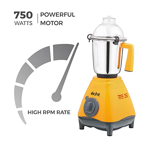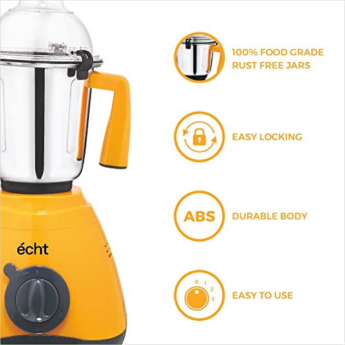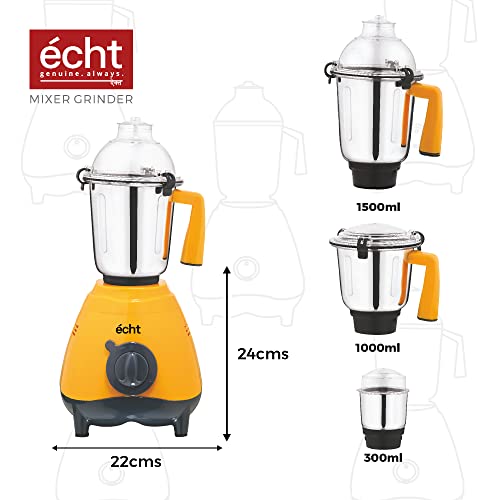 Shop from the wide range of products from the brand Echt. ECHT Mixer Grinder offers newly designed 550W Turbo motor with advanced air ventilation system that gives you the confidence of break down free continous 25 minutes grinding experience even with tough ingredients lile black gram(dal) Wattage: 550 W; Voltage: 230 V; Number of Jars: 3; Jar Size: Wet Jar (1500 ml), Multipurpose Jar (1000 ml), Chutney Jar (300ml); Jar Material: Stainless Steel; Body Material: ABS; Blade Material: Stainless Steel; Speed Control: 3 Speed Control with Pulse. This Mixer Grinder has powerful 750 Watt Motor with 3 speed controls gives an exceptional performance and provides fine mixing and grinding of the ingredients at 3 different speed levels. New and powerful 550 W Turbo Motor, with advanced air ventilation & sturdy coupler, allows 25 minutes* continuous grinding even for tough ingredients like black gram dal.;Along with specialised blades for toughest ingredients, masalas, chutneys, shakes and purees, this appliance comes with leakproof, food-grade stainless steel jars with a semi-transparent lid that allows you to see the ingredients for perfect consistency. Includes: Mixer grinder, Wet Jar, Multipurpose Jar, Chutney Jar. Size Name: Standard. Jar Material: Stainless Steel, Material Blade: Stainless Steel. Hurry up and add this amazing product to your kitchen appliances.