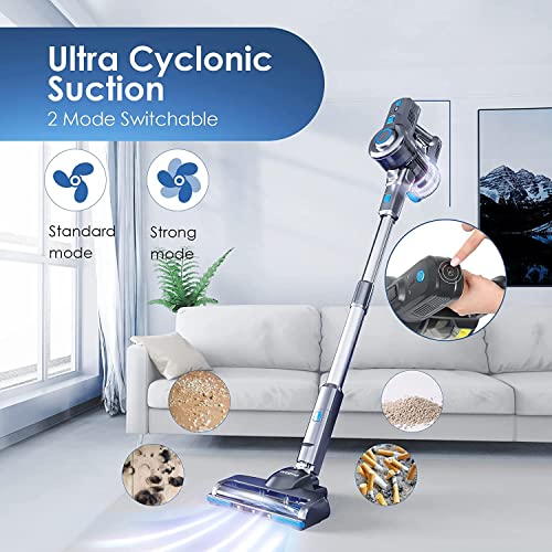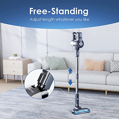 【Powerful Cyclonic Suction】Oraimo stick vacuum cleaner has 2 Hyper suction modes. The power on is default standard mode. “Standard” for daily regular cleaning, “Strong” for deep cleaning. You can adjust to hyper strong suction at your will, easily removes dirt, debris, dust, pet hair, and tough messes. Ideal performance on hardwood floor, low and middle pile carpet, tile, marble etc.