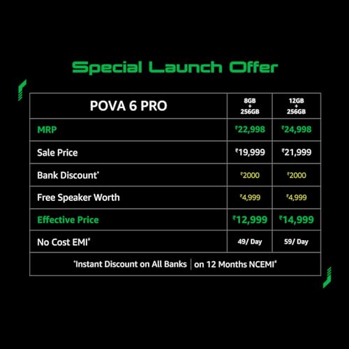 Experience the next level of technology and innovation with the TECNO POVA 6 Pro! This device is designed to meet all your expectations with its groundbreaking Arc interface and powerful features. Experience seamless multitasking and never run out of storage space with our state-of-the-art device boasting Upto 24GB of RAM and 256GB of storage. Store all your precious memories, videos, and important documents without worrying about deleting files ever again. The dual 108MP rear camera with in-sensor-zoom technology captures stunning, ultra-clear photos, while the 32MP selfie camera with dual-tone LED flash and screen fill light ensures you look your best in every shot. The massive 6000mAh battery with the super 70W charger can charge your device 50% in just 19 minutes, and the 10W reverse wired charging feature serves as a power bank in emergencies. The POVA 6 Pro 5G’s 120 Hz and 6.78″ AMOLED display offers an immersive experience, and the high-performing and robust MediaTek Dimensity processor 6080 ensures you can complete all your tasks with ease. The dual speakers with Dolby Atmos create a mesmerizing audio experience, making it perfect for entertainment. Get ready to be amazed by the TECNO POVA 6 Pro!