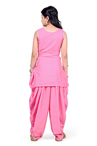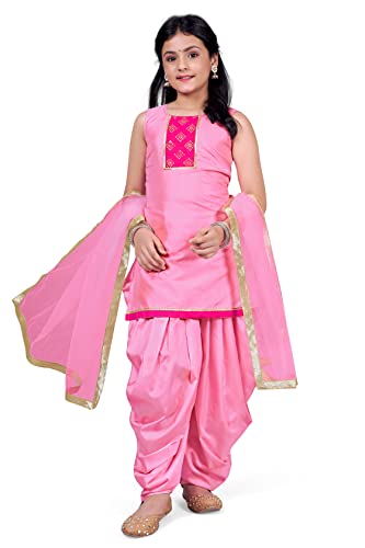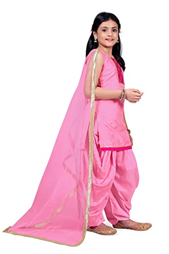 Your little one will be delighted all-seasons with this pink color solid kurta dhoti and dupatta set. The two can be mixed and matched with other items in your baby’s wardrobe for extra versatility. Elevate your girl child traditional look by styling them in this kurta dhoti and dupatta set. In this set the top and bottom made up of taffeta fabric, and dupatta is of net fabric. The solid kurta features round neck with opening at back, sleeveless, butter crepe inner, and highlighted with foil print work pattern with gotta lace border. It also features dhoti style fully elasticated waistline comfortable bottom set. The set comes along with solid pattern lace border work dupatta. The finish this look with golden jewelry to complete your style.