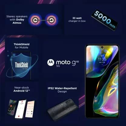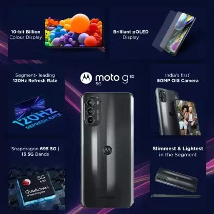 Attaining excellence is a matter of convenience with the impressive Moto G82 5G that comes loaded with incredible features to mesmerise you into the world of awesomeness. Its brilliant pOLED display allows you to experience out-of-the-world visuals with great picture quality. Additionally, the fast refresh rate of 120 Hz enables the fluidic performance of this phone, enabling you to elevate your productivity. Moreover, the 50 MP OIS and an 8 MP two-in-one camera help you capture stunning images with fantastic clarity. Furthermore, Snapdragon 695 5G and an 8 GB of RAM equipped with this phone amplify the smoothness and enhance the user experience.
