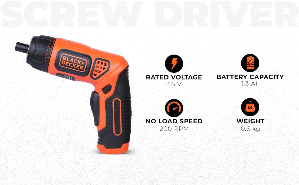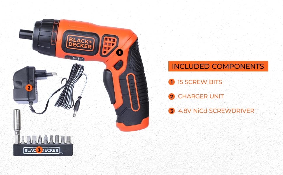 The battery powered cordless screwdriver kit contains : 3.6 Volts Lithium-ion screwdriver, 9 x 25 mm screwdriver bit (SL3, SL5, SL6, PH1, PH2, H3, H5, M5, M6), 1 x Magnetic bit holder and Wall charger for home & professional use
