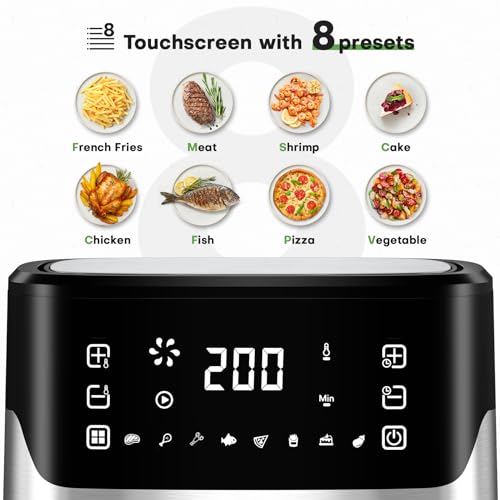 🌽【𝐄𝐚𝐬𝐲 𝐭𝐨 𝐔𝐬𝐞】Take the guesswork out of cooking with the built-in touchscreen menu featuring 8 cooking presets: Fries/Chips, Vegetables, Chicken, Meat, Shrimp, Cake, Fish, and Pizza. Equipped with a wide temperature range from 80°C to 200°C in 10°C increments and a cooking timer for up to 60 minutes. You can effortlessly modify settings during the cooking process, ensuring optimal results for each meal.