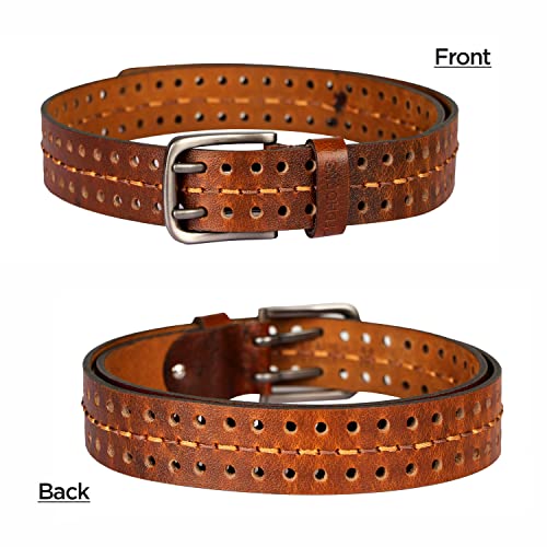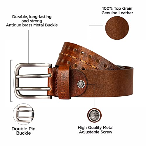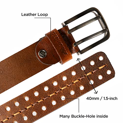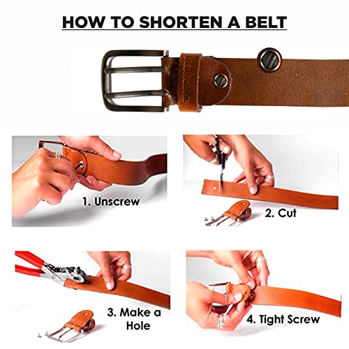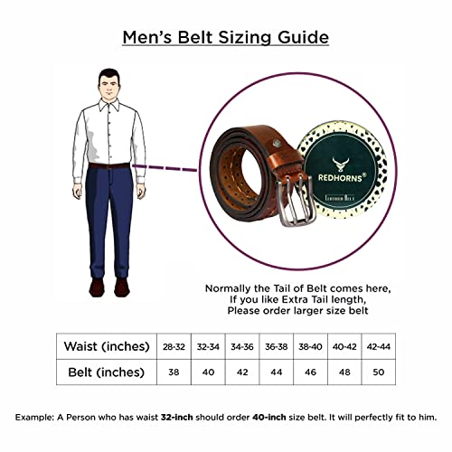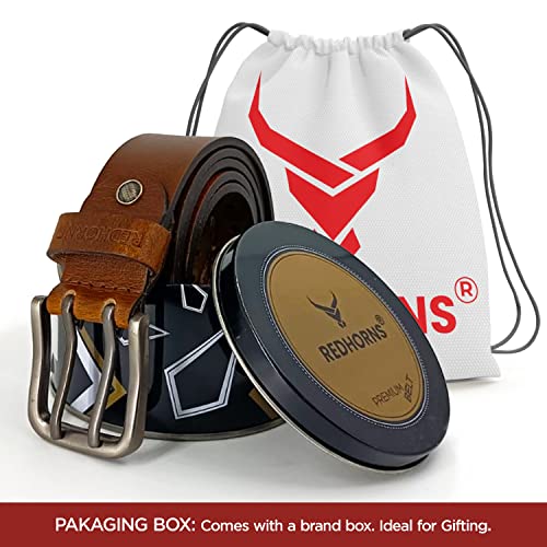 REDHORNS introduces men’s leather belts for jeans, trousers, and pants on every casual wear, formal wear. The belt is crafted with an oily texture finish of genuine leather which makes it durable and a suitable option for rough and tough use. The good quality of the belt ensures you confident wear. The belt has an antique finish buckle pin closure that gives a trendy look to the belt and makes it more stylish and smart which goes with all of your clothing. The sleek look and evergreen vintage color with oily texture finish of the belt make it an ideal choice to put with any jeans, formal or casual pants, trousers, etc., on any occasion, whether it is formal or any social gathering. The total length of these leather men’s belts approx 42-52 inches. There are multiple holes with buckle pin closure on the mens belt to make the belt fits more waistline size. Adjustable size fits waist 32 inches to 46 inches. The leather belt can be easily adjusted to your size in just 4 easy steps I.E 1. Unscrew the buckle 2. Pull the buckle out 3. Cut the belt strap according to your size and make a hole with the punch. 4. Attach the buckle and screw again. Voila, your belt is ready. This casual formal leather belt comes in a premium gift box pamper your loved ones with this stylish belt which is suitable for any occasion like a birthday gift, Diwali gift, Anniversary gift, or rakhi gift.
