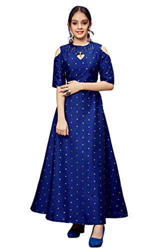 Dress your little girl with this maxi style dress from Fashion Dream available on Amazon. Style this Dress with temple jewelry for a classic look. Available color of Purple and Dark Green in Jacquard Silk Designer gown with sequence work from Fashion Dream. Beautiful gold buti printed design gown for comfortable fit. We have combination of fine quality fabric finish, latest design and trending fashion. This beautiful gown is short cap sleeve and floor length with sequence work in front of round neck and comes with a belt Pattern. This ethnic wear dress is perfect for all Special occasions like wedding, ceremony, festival and gift to little princess.