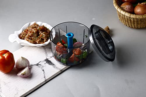 Super-sharp stainless steel blades are placed at different levels in such a way that they cover the entire height of the chopper, and manage to chop very easily in seconds.