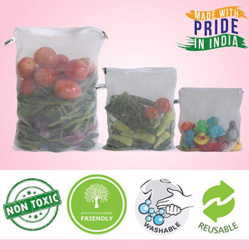Pack of 9 Multiple Sizes Meet All You Need – 9 High Quality Bags in 3 Sizes Makes Them Very Versatile, Package Contains 3 Large size 14×9 Inches, 3 Medium Sizes 12×9 Inches, and 3 Small Size 10×9 Inches Bags, Great Not Only For Veggies and Fruit, But Also Great For Toys, Stationery, Beuaty Or Fragile Products.