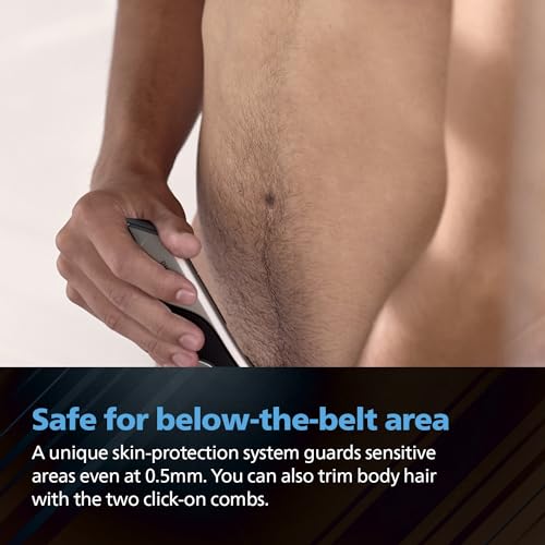 Safe to use for below the belt area with body shaver attachment. The Skin Protection System guards sensitive areas even if you trim as close as 0.5mm. You can also trim body hair with the two click-on combs.