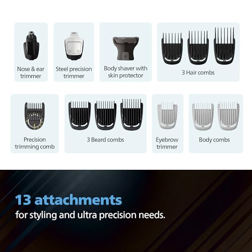 The new All-in-one Ultimate Precision Trimmer by Philips with 13-in-1 Multigrooming Kit. Versatile styling for Face, Hair and Body at home. It also comes with a nose and ear trimmer attachment which removes unwanted nose and ear hair quickly and safely. Avoid any nicks and cuts in the nose and ear area.