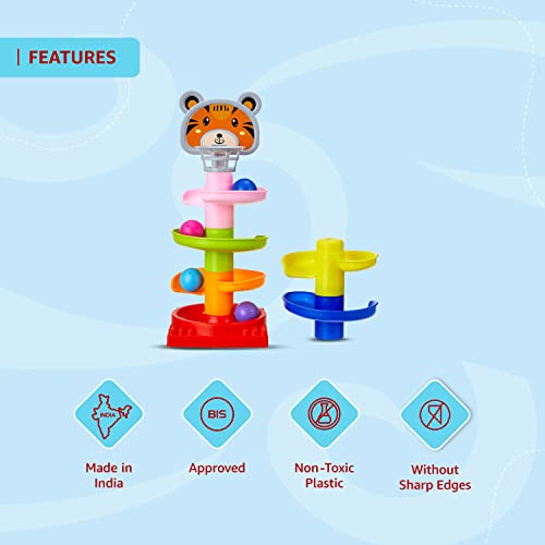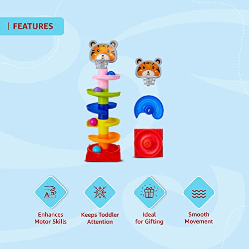 Ball drop tower has 5 layers with swirling ramps and 3 puzzle rattle balls for endless fun. Simply place the ball in the top hole and watch it fall and roll through each tier.