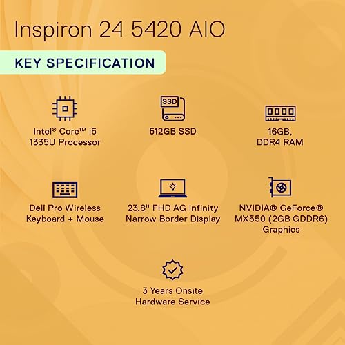 i5-1335U | 16GB DDR4 | 512GB SSD | Win 11 + Office H&S 2021 | NVIDIA® GeForce® MX550 (2GB GDDR6) | 23.8″ FHD AG Infinity Narrow Border | Dell Pro Wireless Keyboard + Mouse | 3 Years Onsite Hardware Service | NA | Cover White Fabric Chin
