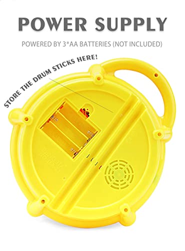 This drum features a volume button, a music button with 4 songs, drum head consists 5 colors of flashing lights & a switch to 3 modes.