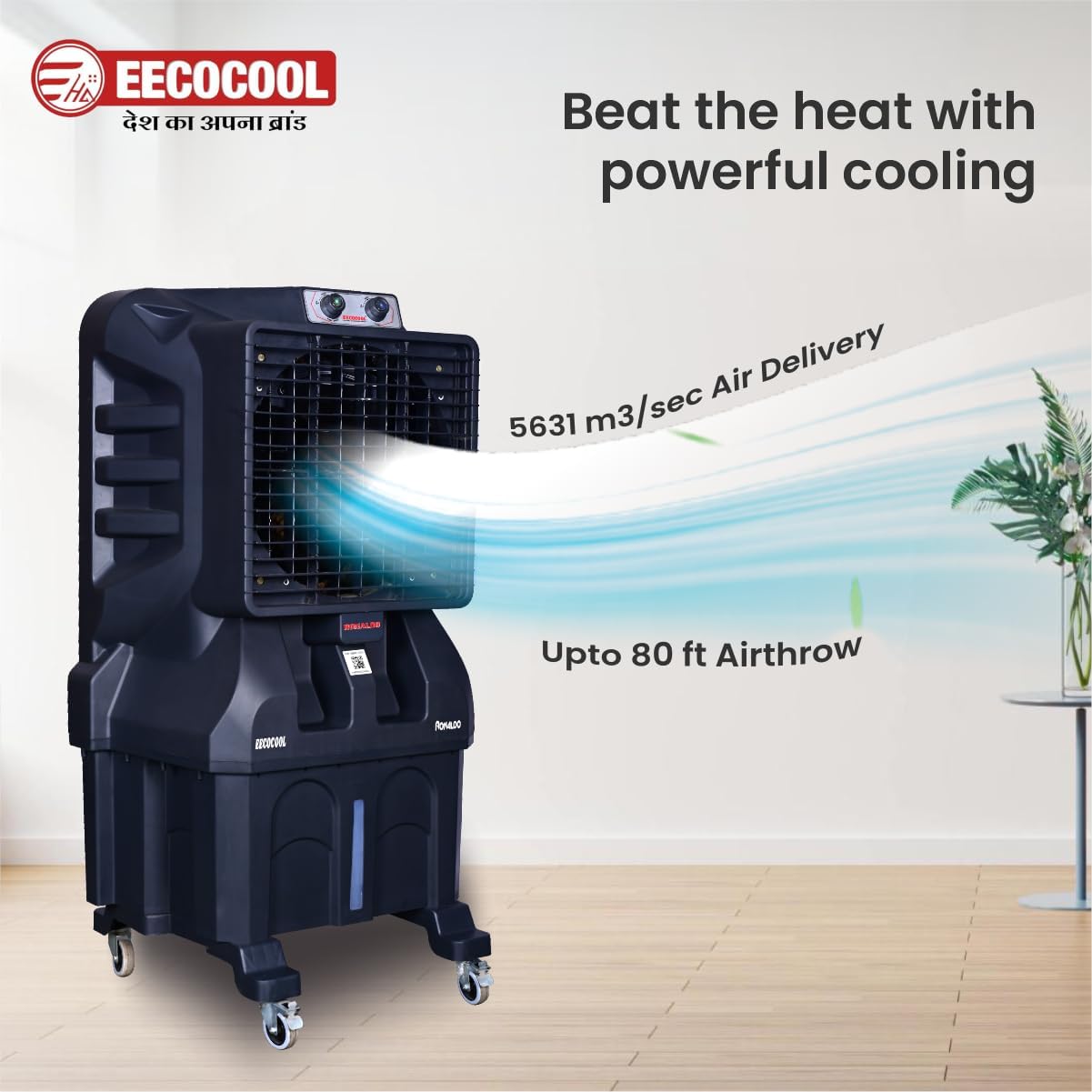 EECOCOOL Ronaldo 95 L Desert Air Cooler for Home, Honeycomb Cooling Pad, Auto Swing Technology | Powerful Air Cooler for Room, 3 Way Speed Control | Inverter Compatible