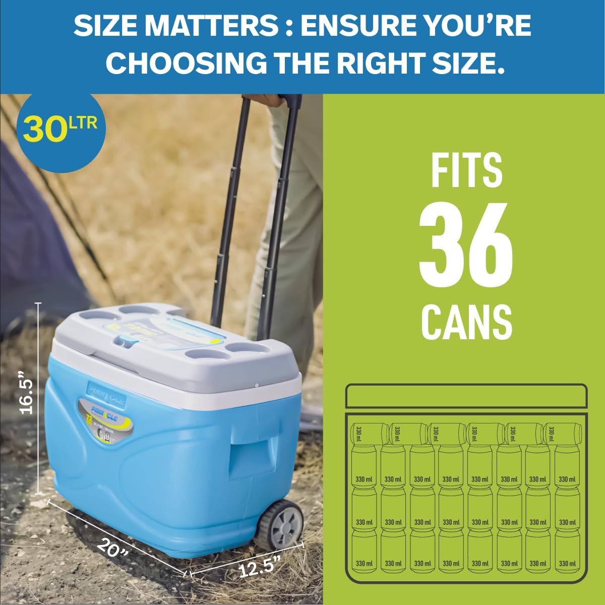 ALL TERRAIN WHEELS: Equipped with sturdy grip wheels and telescopic handles, this ice cooler box ensures easy maneuverability over any terrain, making it ideal for transporting chilled drinks, snacks, and essentials on picnics, camping trips, or beach outings.
