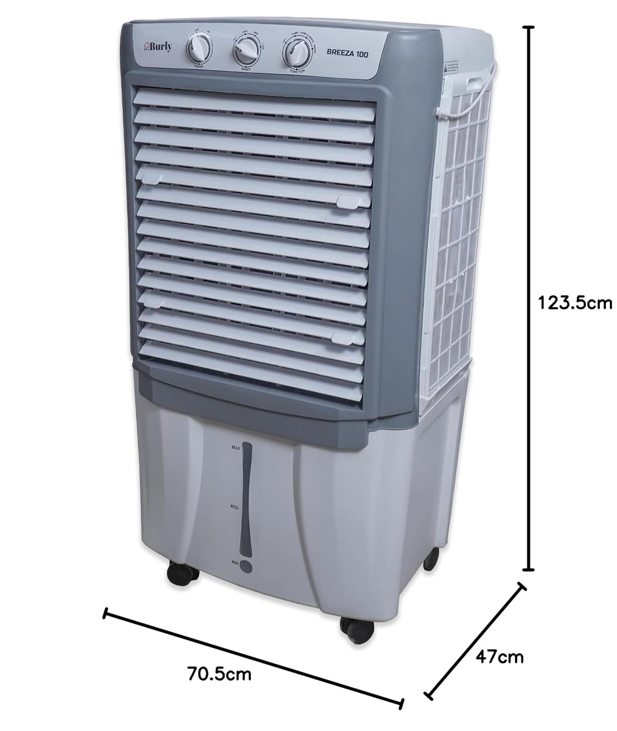 Introducing the Burly Brezza Desert Air Cooler-100L, a pinnacle of cooling technology designed to redefine your comfort. Powered by the Everlast Pump, this cooler guarantees consistent cooling performance with an impressive 100L capacity. The easy-clean ice chamber accelerates the cooling process, providing rapid relief in warm conditions. Revel in the powerful air throw with auto swing, ensuring optimal and widespread cooling throughout your space. The thoughtful inclusion of an auto-drain feature and a mosquito net filter adds to the convenience, ensuring hassle-free maintenance and protection. The sophisticated grey and white design not only complements various interiors but also adds a touch of contemporary elegance. The Burly Breeza Desert Air Cooler is a testament to innovation, seamlessly combining power and efficiency for an unparalleled cooling experience. Your consideration of this advanced solution is highly appreciated, promising to elevate your expectations of cooling comfort.