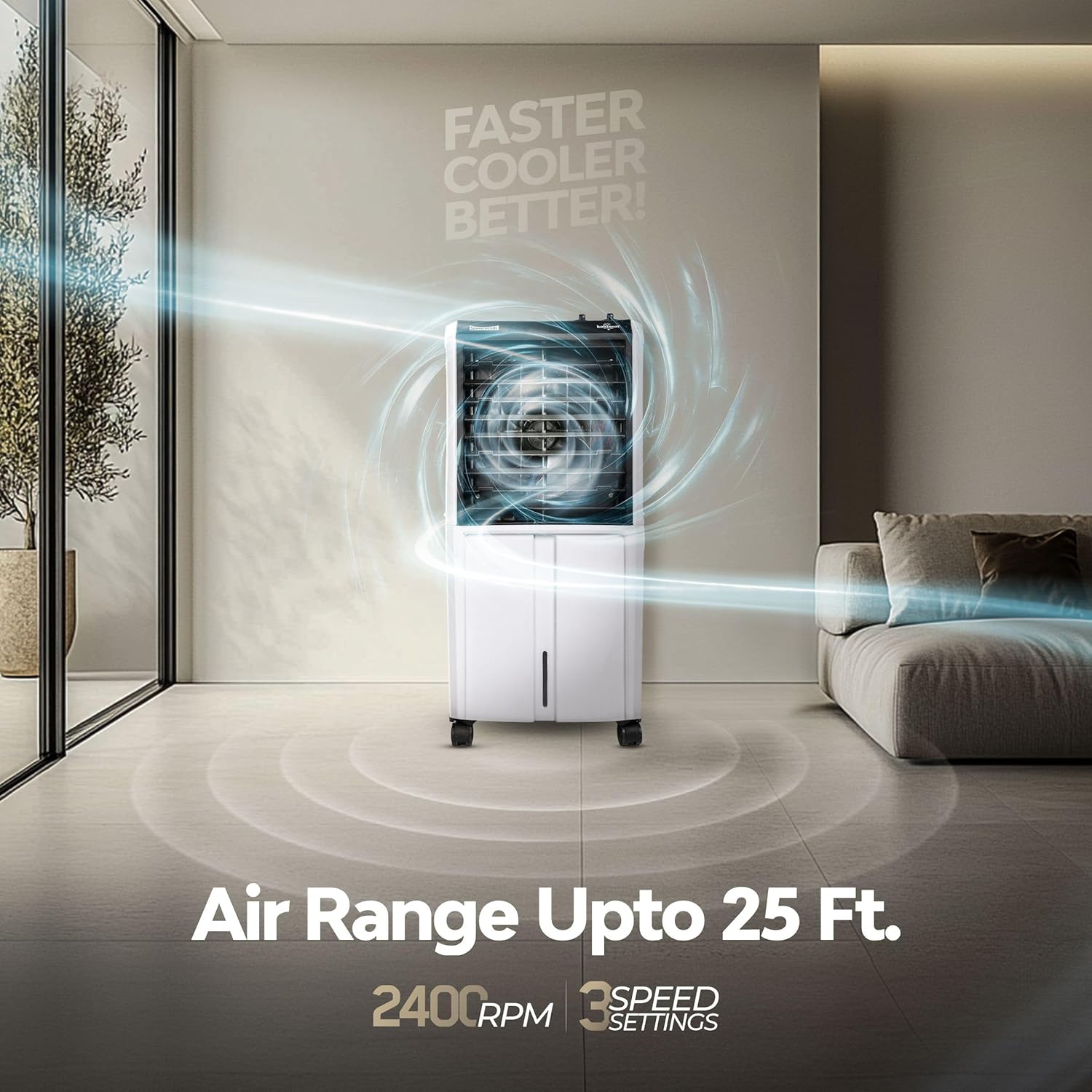 【SPECIFICATION】: 65 Litres water tank capacity, 25 Feet Air Throw, White Cooler For Room