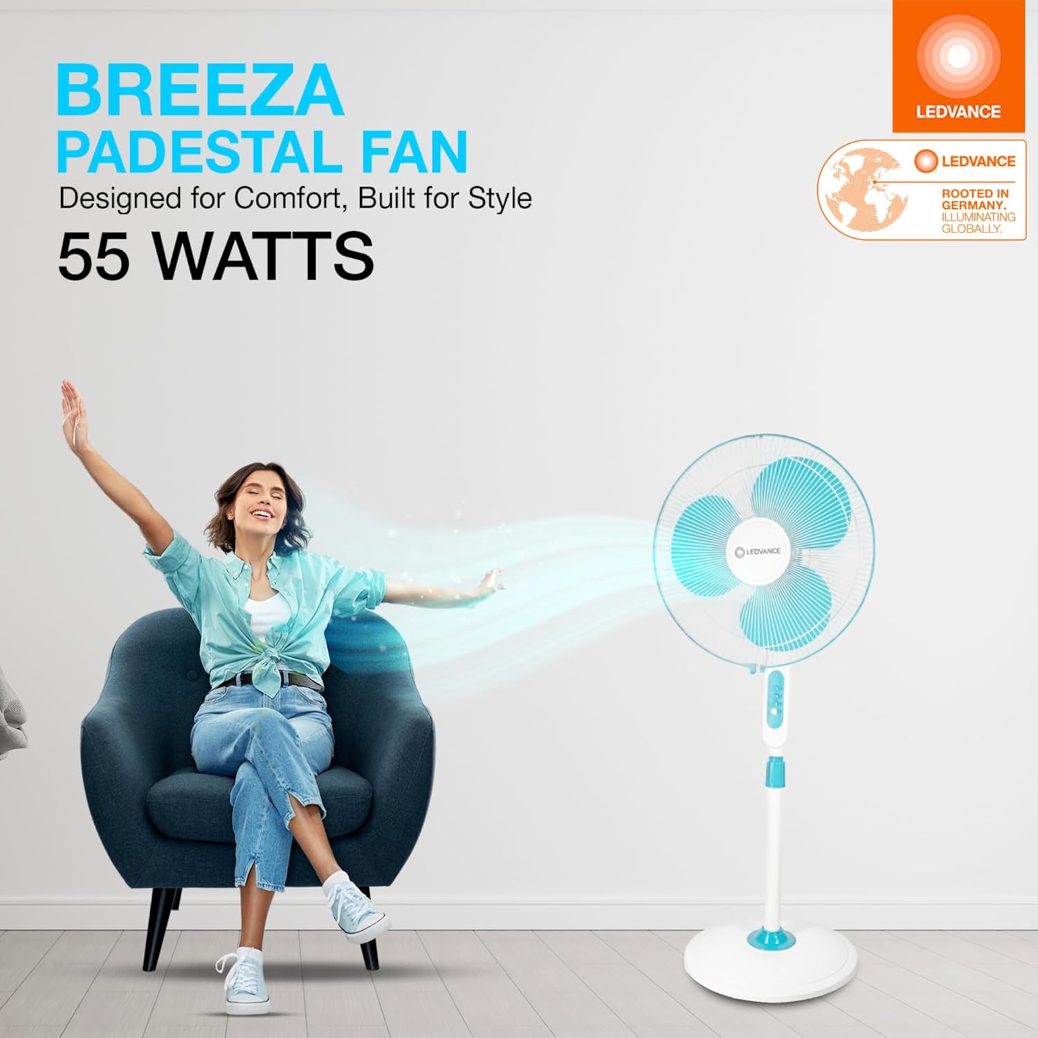 The Ledvance Brezza 400mm Pedestal Fan offers high-speed airflow with smooth oscillation, making it perfect for home use. Featuring a rust-free body, adjustable height with a telescopic arrangement, and ISI certification, this fan combines durability, comfort, and safety. Backed by a 2-year warranty for peace of mind.