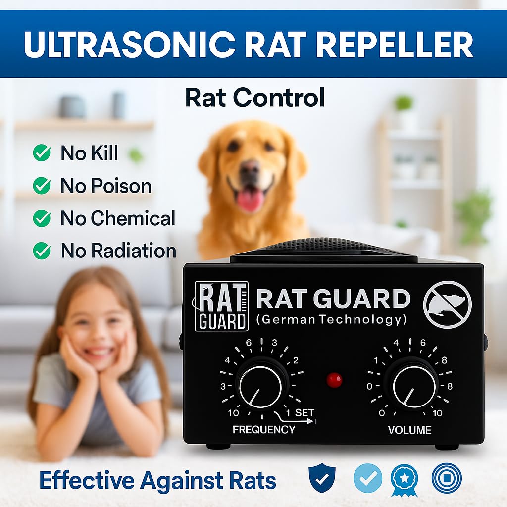 Covers up to 1,500 sq. ft. — Ideal for homes, godowns, offices & warehousesJust plug & play — No refills, no chemicals, no extra maintenanceSafe for kids & pets — Uses ultrasonic sound only, no poison or radiationAdjustable frequency & volume — Customize to suit your space & rodent levelLong-term protection — Built to last 6–7 years with powerful performance Solution — A smart alternative to traps, sprays, or harmful toxins