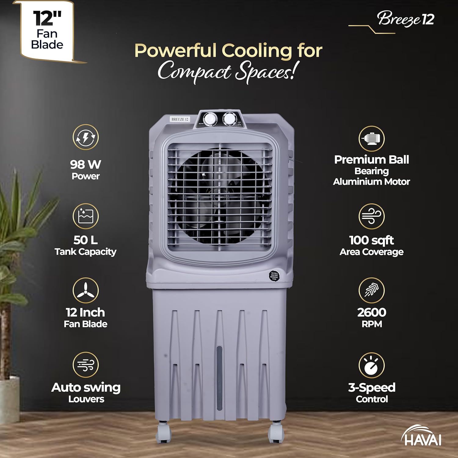 Experience efficient and refreshing cooling with the HAVAI Breeze-12 Personal Air Cooler, designed to deliver powerful airflow while maintaining low power consumption. Ideal for bedrooms, offices, shops, and small indoor spaces, Breeze-12 combines performance, convenience, and durability in a compact tower design. The cooler features a 12-inch 3-leaf fan blade operating at 2600 RPM, delivering an 8-ft air throw and effective cooling for areas up to 100 sq. ft. High-efficiency 50 mm honeycomb cooling pads enhance water retention and heat absorption, ensuring faster and longer-lasting cooling during hot summer days. With a 50-litre water tank, Breeze-12 supports extended usage without frequent refilling. The float valve automatically maintains the correct water level, while the bottom drain plug allows easy water removal and hassle-free cleaning. Powered by a durable aluminium motor, the cooler offers reliable, long-lasting performance with improved heat dissipation while consuming just 98 watts, making it an energy-efficient choice for daily use. The auto-swing vertical louvers ensure uniform air distribution, and the 3-speed control lets you customize airflow based on your comfort. Designed for convenience, Breeze-12 includes heavy-duty wheels for easy mobility and operates at a low noise level of approximately 65 dB, making it suitable for both residential and work environments. Backed by a 1-Year On-Site Warranty, the HAVAI Breeze-12 is a dependable and practical cooling solution for modern living.