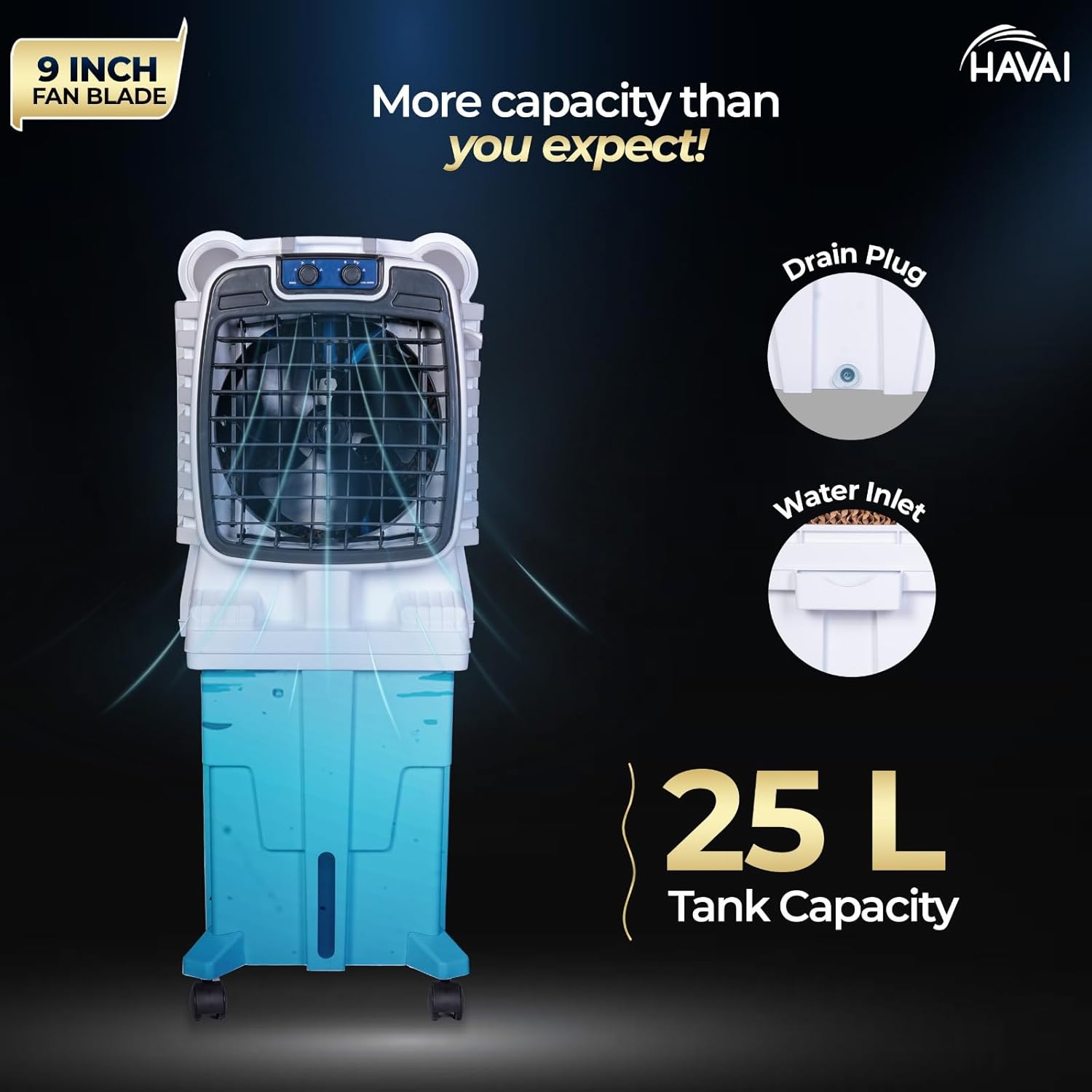 Introducing the HAVAI Arizona 9 Personal Air Cooler, an innovative cooling solution designed for efficient personal use in small spaces. Arizona 9 proudly becomes India’s first air cooler with a 9-inch fan blade, setting a new benchmark in compact cooling. Despite its compact size, Arizona 9 delivers strong performance with a high-speed 2600 RPM top-mounted ball bearing motor, producing 2200 m³/hr air delivery with a focused air throw of up to 5 feet. This ensures effective cooling exactly where it is needed. For enhanced cooling efficiency, Arizona 9 is equipped with three-side honeycomb cooling pads, which offer better water absorption, improved airflow cooling, and faster temperature reduction compared to conventional pads—making it highly effective even in compact environments. Designed for areas up to 50 sq ft, Arizona 9 is ideal for bedrooms, study rooms, office cabins, shops, and hostels. The 25-litre water tank allows longer cooling hours, while motorised vertical louvers ensure uniform air circulation. Its compact 66 cm height and lightweight 5.7 kg build make it easy to place anywhere. The top-mounted handle and castor wheels provide effortless mobility across rooms. Operating at just 120W, Arizona 9 is energy efficient and economical to run. Backed by HAVAI’s trusted quality, it includes a 1-year warranty on the main motor and assured post-warranty spare part availability, ensuring long-term reliability. Choose HAVAI Arizona 9 for compact innovation, superior cooling with 3-side honeycomb pads, and focused personal comfort.