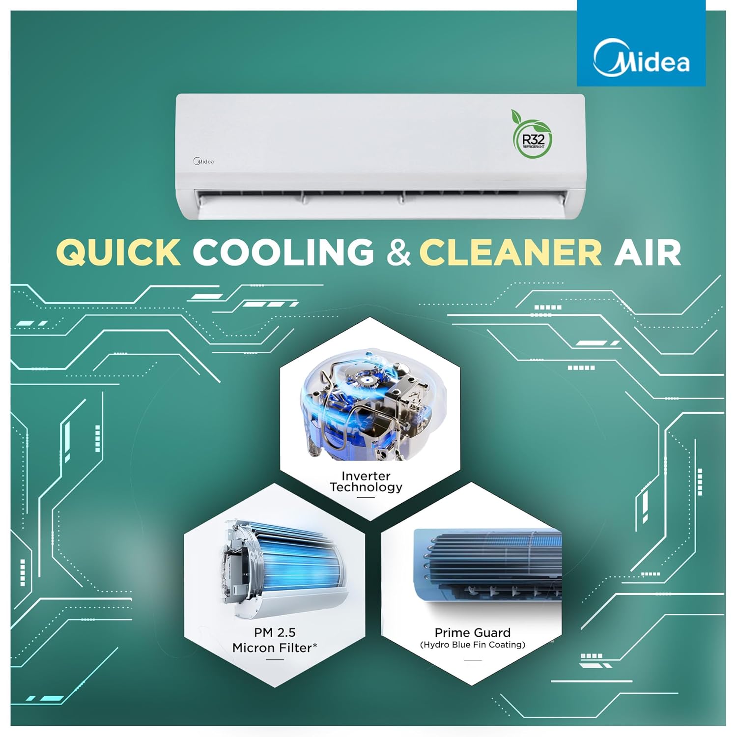 Enjoy intelligent and powerful cooling with the Midea 2026 Model 1.5 Ton 3 Star Split Inverter Convertible 6-in-1 Air Conditioner (Santis Max DLX-MAI12SD3R36F0), designed for modern homes and varying Indian weather conditions. Driven by Mideaβs global innovation, this AC delivers reliable performance with smart adaptability. Equipped with advanced Inverter Technology with Auto Intelligence, the AC automatically optimizes cooling based on room conditions and usage patterns for enhanced comfort and energy efficiency. The 6-in-1 Convertible modes offer flexible control over cooling capacity, allowing efficient performance across seasons. When temperatures rise, Turbo Mode delivers faster cooling for instant comfort. For cleaner and healthier indoor air, the AC features a dual filtration system with HD Filter and PM 2.5 Filter, helping reduce fine dust particles and airborne impurities. The Auto Defrost Clean function prevents internal moisture and dust buildup, ensuring hygienic airflow and long-lasting performance. With its sleek Santis Max DLX design, quiet operation, and dependable cooling, this Midea AC is a smart, efficient, and comfortable solution for everyday living.