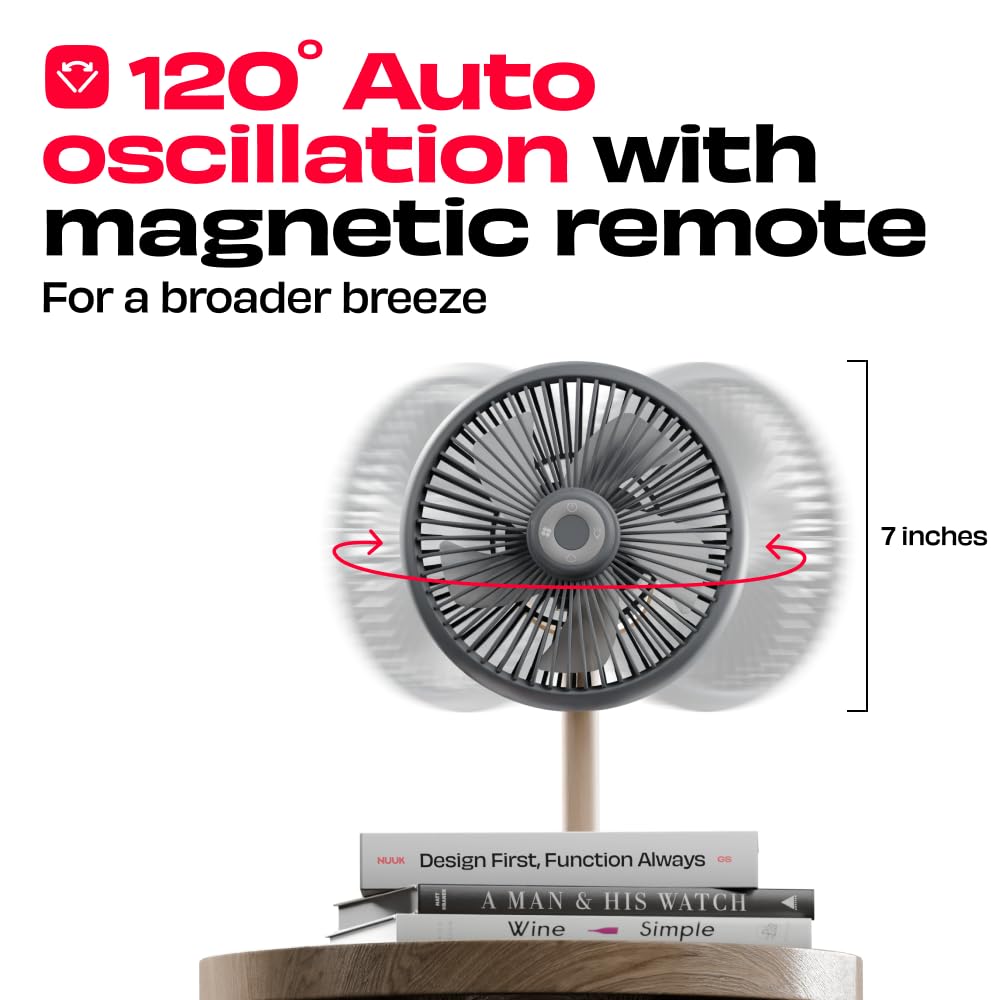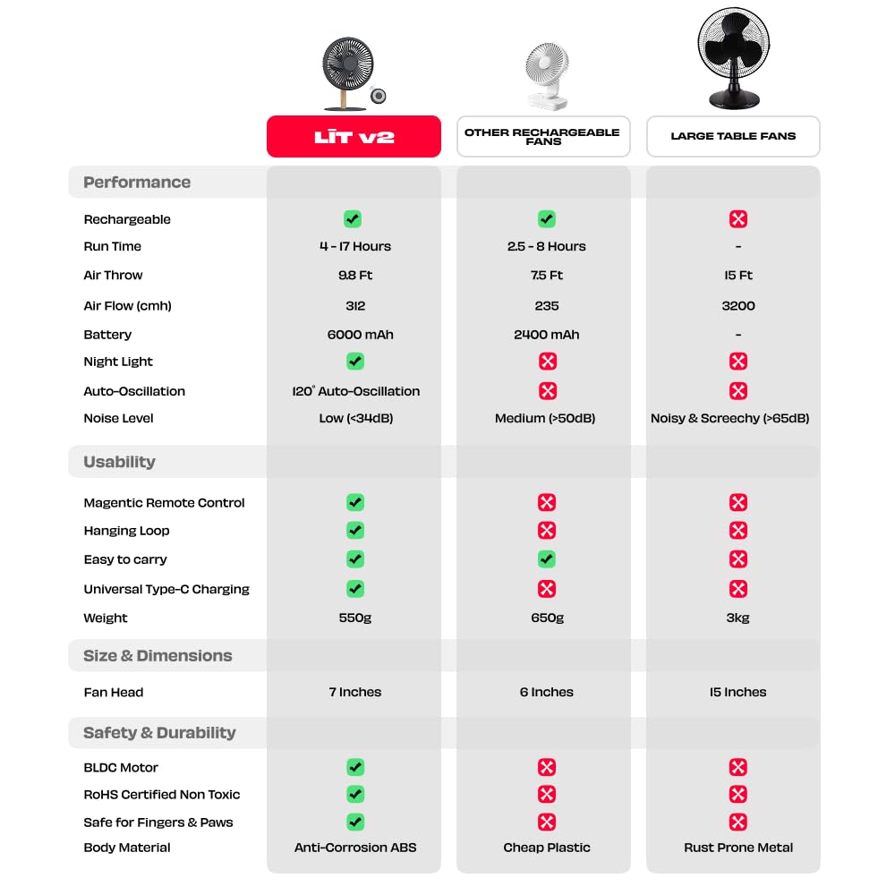 LIT offers silent operation, a 6000mAh battery (17-hour runtime), 120Β° oscillation, four speed modes, a built-in night light, and a premium beechwood standβall in a stylish, portable design.