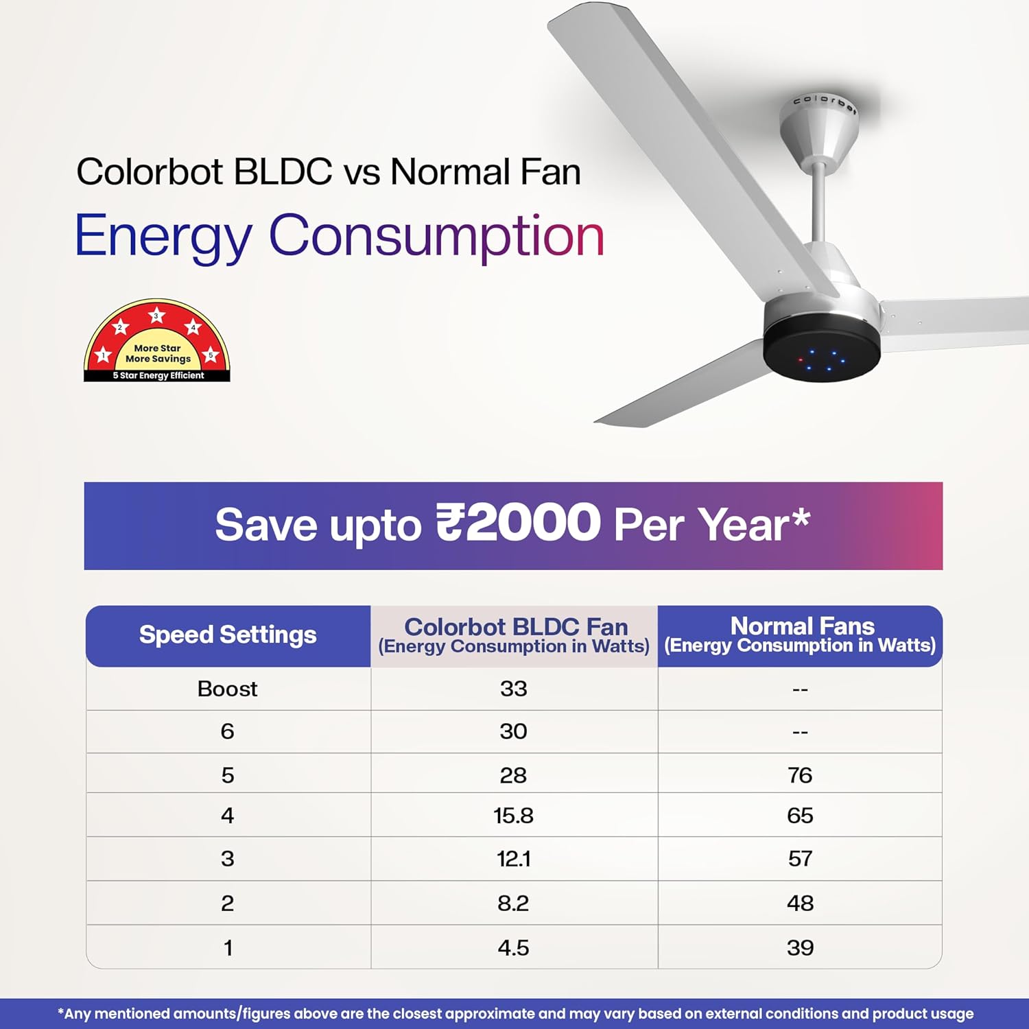 ENERGY EFFICIENT BLDC TECHNOLOGY: Colorbot Stella runs on BLDC motor consuming only 26W (at speed 5), 3x longer on inverter batteries, energy efficient.