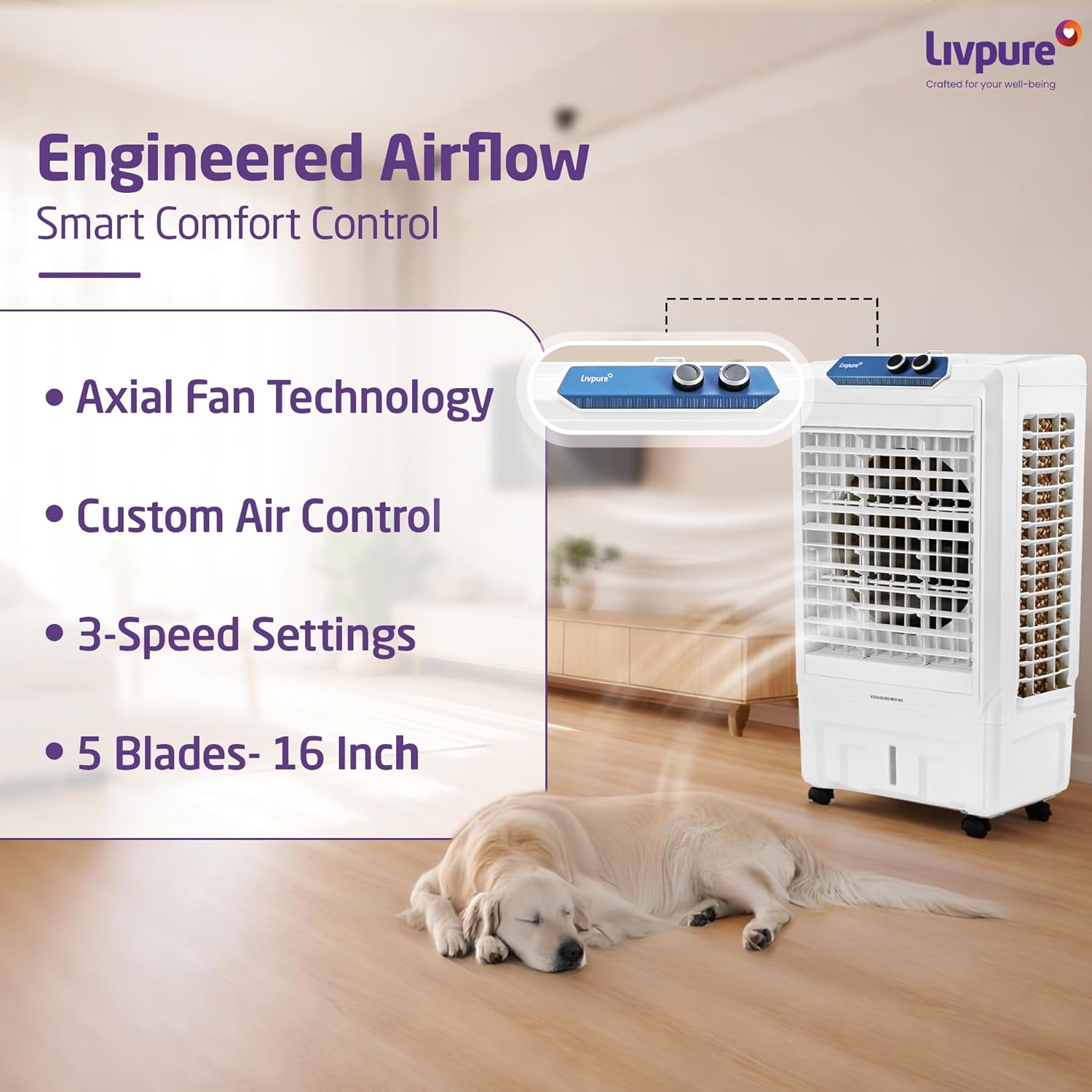 Advanced Airflow Control: Powered by axial fan technology, a 16-inch 5-blade fan, and 3-speed control, Livpure cooler ensures custom airflow control for consistent cooling even during peak summer heat.