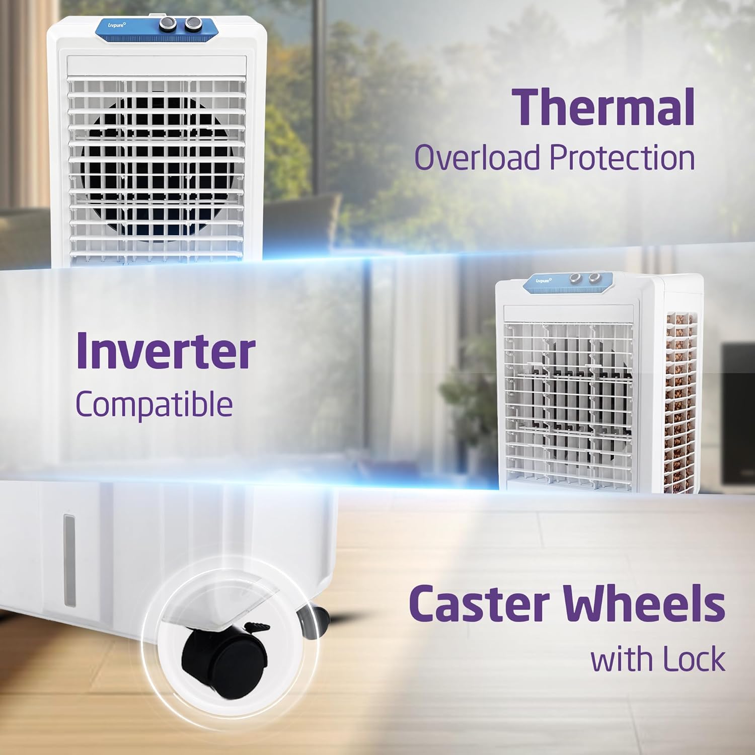 Built for Everyday Reliability & Power Safety: Thermal overload protection prevents overheating and supports longer motor life. With inverter compatibility, this air cooler maintains stable cooling performance during voltage fluctuations and power cuts.