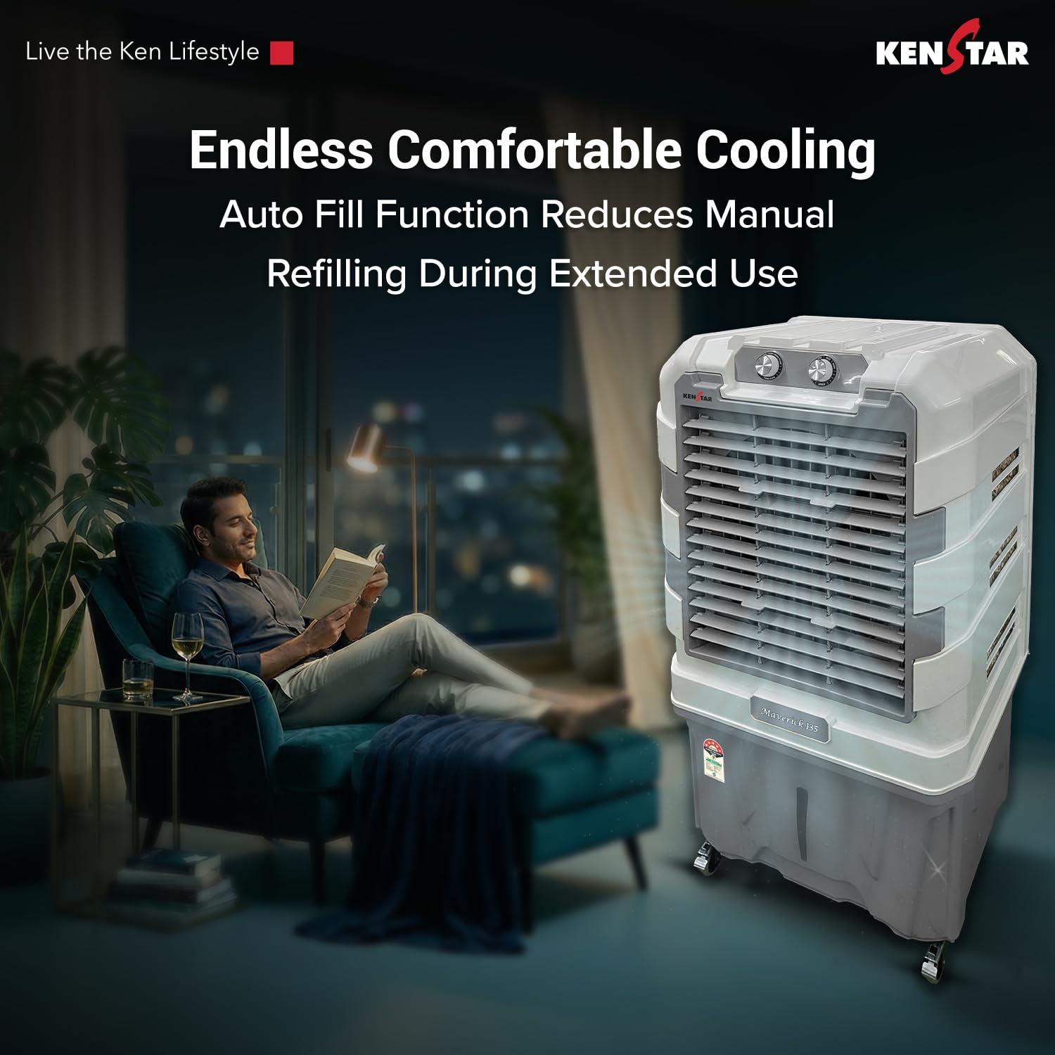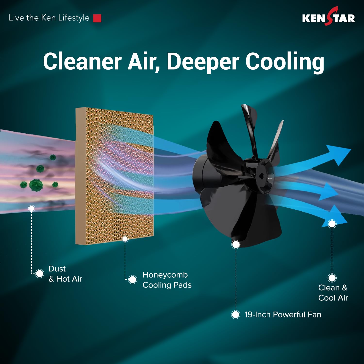 Stay cool with the Kenstar Maverick HC 135 Desert Air Cooler, designed for powerful cooling in large spaces. It features an 80-inch air throw, efficient honeycomb pads, and a durable 4-pole motor (1350 RPM) for consistent airflow. With 3-speed control and a reliable submersible pump, it ensures comfortable cooling. Sturdy build, 19-inch fan, and 1-year warranty, 5 year warranty on motor and pump, make it a dependable summer solution.