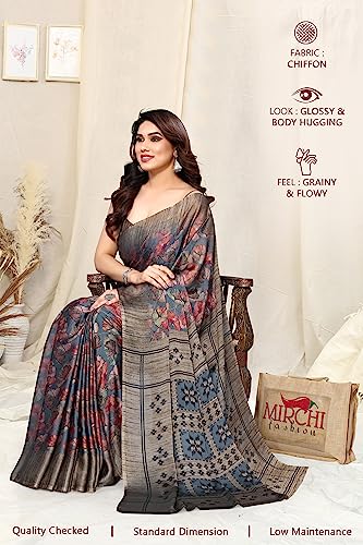 Beautifully designed Indian Traditional ethnic regular wear sarees made of high-quality fabric Chiffon having beautiful floral printed design with contrast solid broad border and pallu. Mirchi Fashion brings you a nice addition to the wardrobe of every fashionable female, who wants to look glamorous and distinct.This sari comes with contrast Chiffon solid blouse fabric, which can be stitched according to your comfort Up to 32 to 42 Inches.