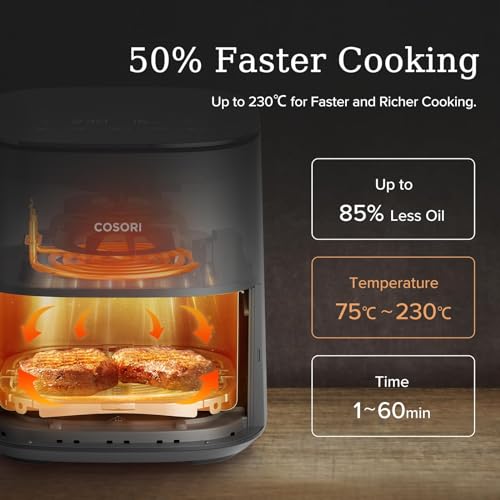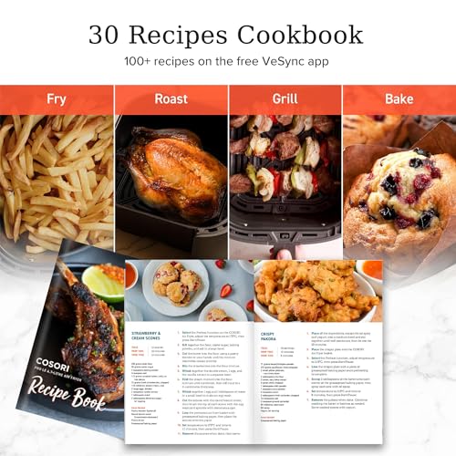 【30 RECIPES COOKBOOK & ONLINE RECIPES】The air fryer includes a cookbook of 30+ original recipes by Cosori R&D chefs and 100+ recipes on the free VeSync app