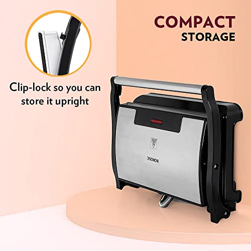 The Borosil Meta Prime Grill Sandwich Maker allows you to make 2 sandwiches with medium sized bread slices, at the same time! The lid opens up 90°, allowing for easy assembly and removal. Perfect for families who like to eat together. The 700W power on this sandwich maker, combined with the deep ribs for crisp grilling will ensure that you get perfectly toasted sandwiches in a jiffy.
